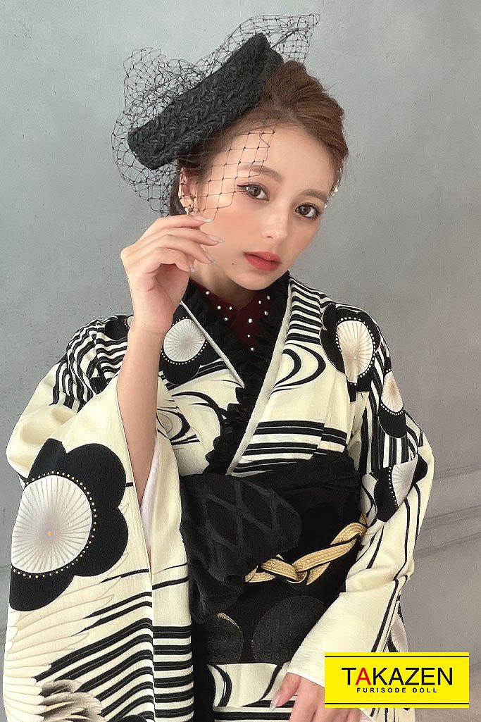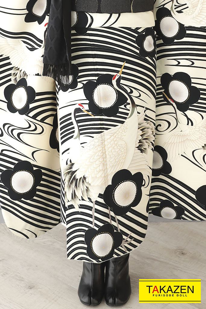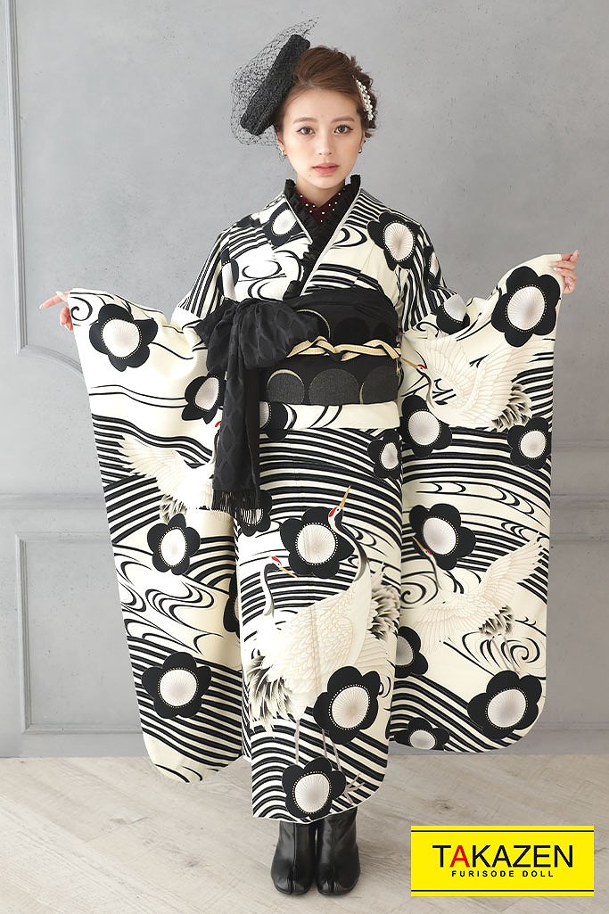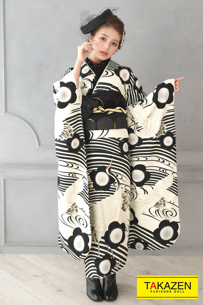 Facebook Pixel 安いレトロ 白/黒 鶴柄/梅柄 おしゃれ モノトーン レトロモダン 格安振袖 ブーツコーデ振袖ネットレンタル 31029|成⼈式の振袖ネットレンタルならFURISODE DOLL(フリソデドール)【全国対応】by TAKAZEN FURISODE DOLL